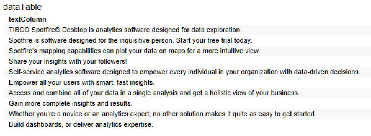 For more robust content searching, TIBCO Spotfire Content Analytics can also be used. Content Analytics provides a mechanism for finding contextual meaning and relationships in the data, along with full text search and sentiment analysis. For more information on Content Analytics, click here.