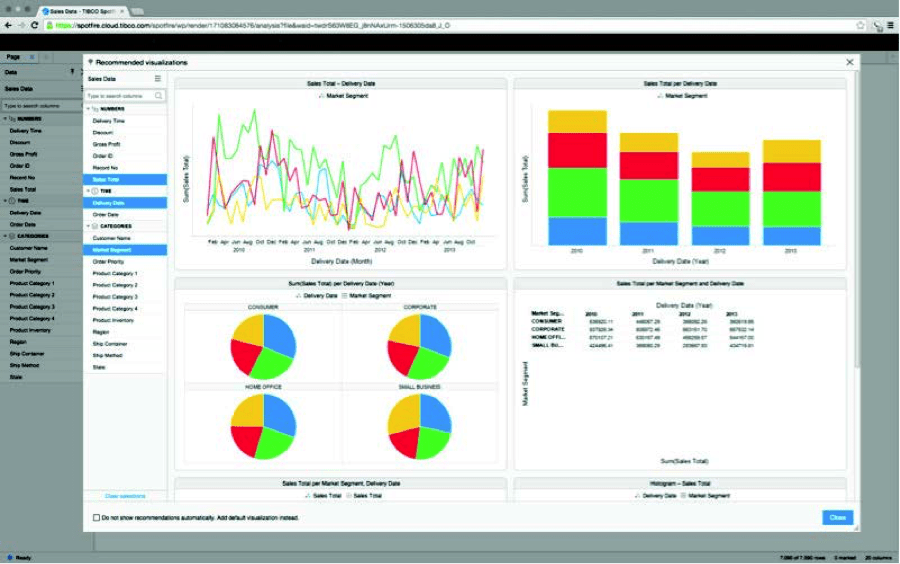 After clicking the Recommendations icon and selecting your data set, users are presented with a gallery of possible visualizations, then choose the ones that suit their needs. Users do not have to load data files and drag datasets into columns. Once the user chooses a visualization, Spotfire renders it and allows the user to further customize or start instantly analyzing their data to find “aha! moments.”