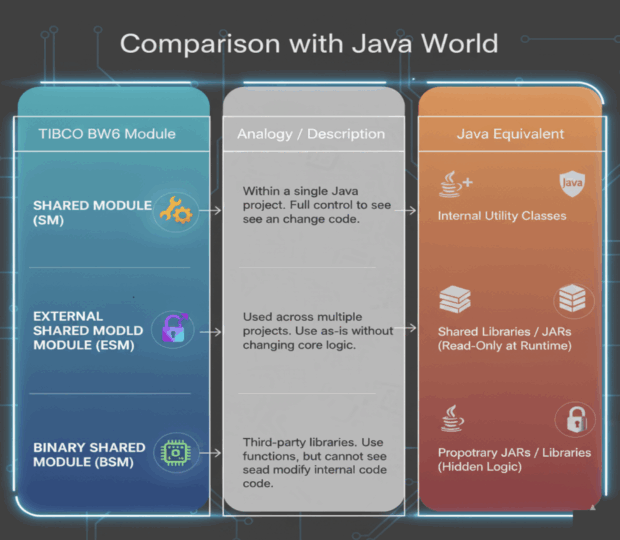 In the world of integration, efficiency and consistency are key. TIBCO ActiveMatrix BusinessWorks 6 (BW6) empowers developers with powerful mechanisms for code reuse, but sometimes the nuances can get a little tricky. Today, we’re demystifying three core concepts that are vital for building scalable and maintainable applications: Shared Modules (SM), External Shared Modules (ESM), and Binary Shared Modules (BSM).